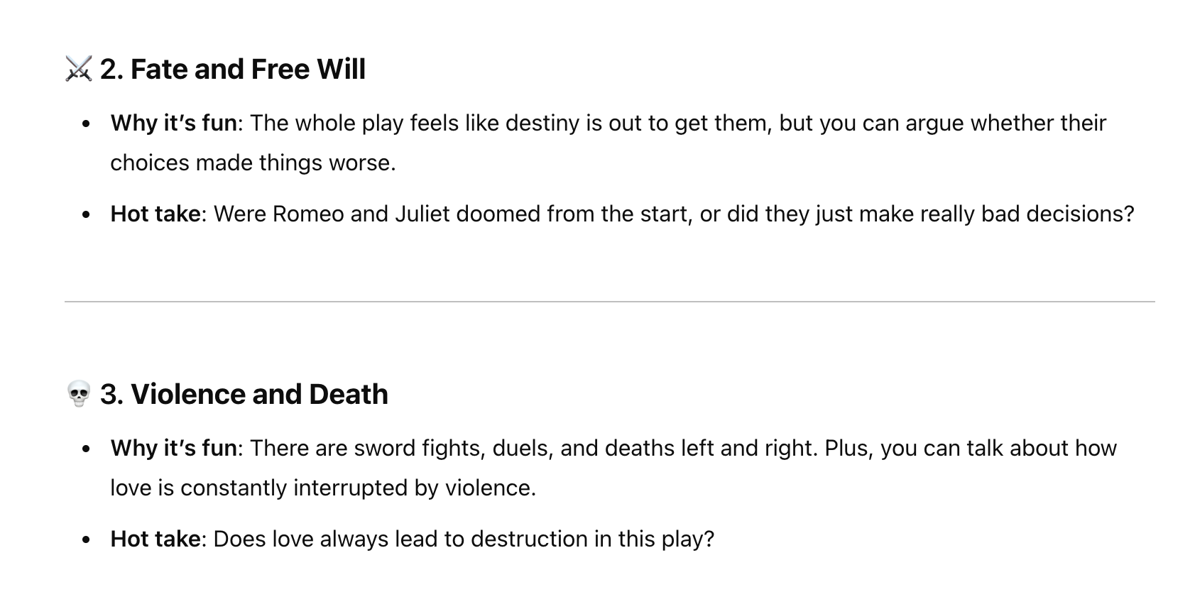We also suggest creating writing prompts that strategically discourage AI use. Personal reflections are a great way to bypass the temptation to use AI. For example, you may ask students to reflect on a specific discussion you had in class, or to write about a time they experienced a similar dilemma to one they have identified in the play. It can also be helpful to break down longer writing assignments into several steps, requiring students to first submit an essay idea, then an outline, and then a rough draft. Asking students to show their thought process as they progress through the assignment prevents them from jumping to the final product through AI use alone. You can also require them to complete some or all of these brainstorming assignments in class the old fashioned way, using pen and paper. It can be a daunting task to convince students that they shouldn’t allow AI to do all of their thinking for them, but the hope is that, given the opportunity to see their writing improve and produce work they are proud of, most students will see the value in exercising their creativity and critical thinking skills. Now, let’s discuss a few things AI does well when it comes to supporting Shakespeare instruction.
